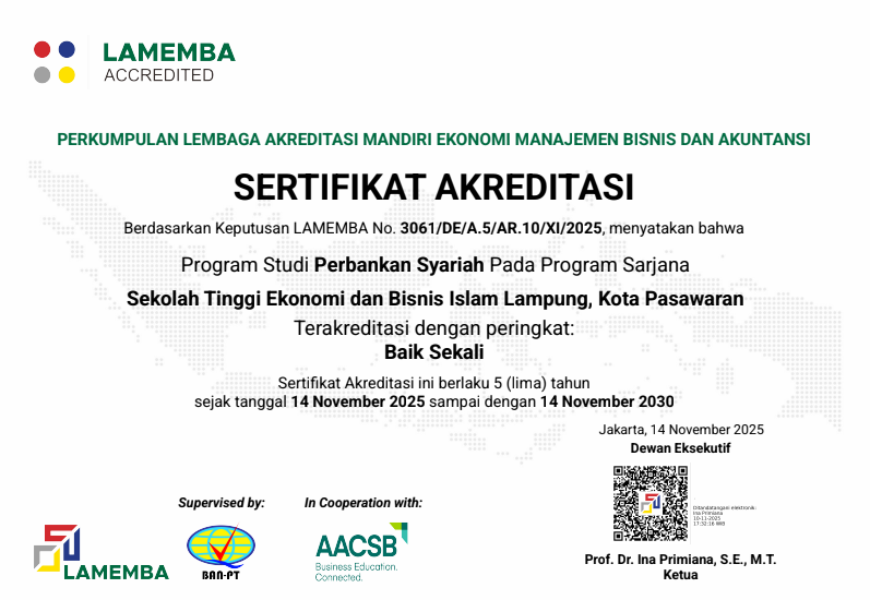Dengan penuh rasa syukur dan kebanggaan yang mendalam, kami mengumumkan pencapaian luar biasa bagi institusi kami [Nama Institusi]. Berkat kerja keras, dedikasi, dan kolaborasi seluruh sivitas akademika, kedua program studi unggulan kami, S1 Ekonomi Syariah dan S1 Perbankan Syariah, telah berhasil meraih Akreditasi Baik Sekali dari Lembaga Akreditasi Mandiri Ekonomi, Manajemen, Bisnis, dan Akuntansi (LAMEMBA).
